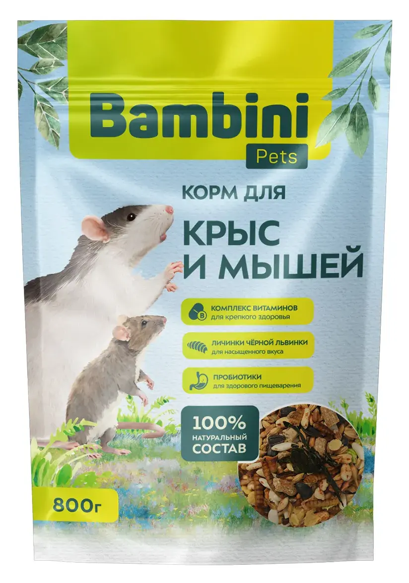 Корм Bambini Pets Корм для крыс и мышей — сбалансированное полнорационное питание. Все ингредиенты входящие в состав корма подобраны с учетом вкусовых потребностей крыс и мышей.